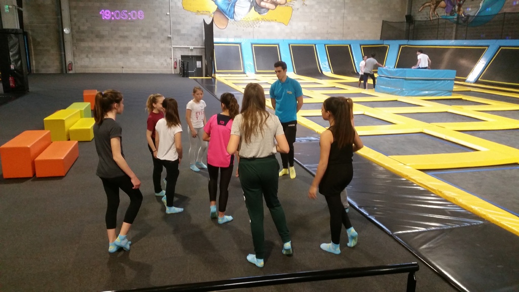 Après un échauffement (voir photo); et oui il faut toujours s'échauffer avant une activité physique, les filles ont pu s'amuser à rebondir dans tous les sens, plonger dans une fosse en mousse. Et même faire des shoots, voire des dunks pour certaines !!