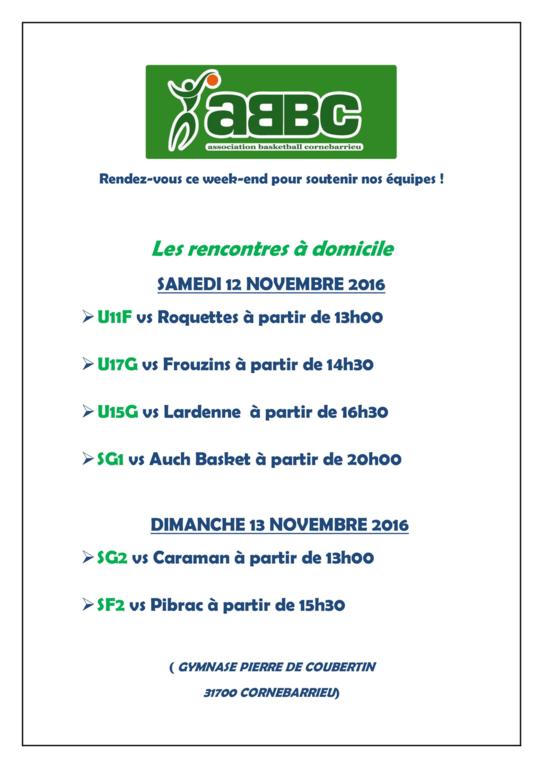 Voici le programmes des rencontres à domicile pour le week-end des 12/13 Novembre 2016.