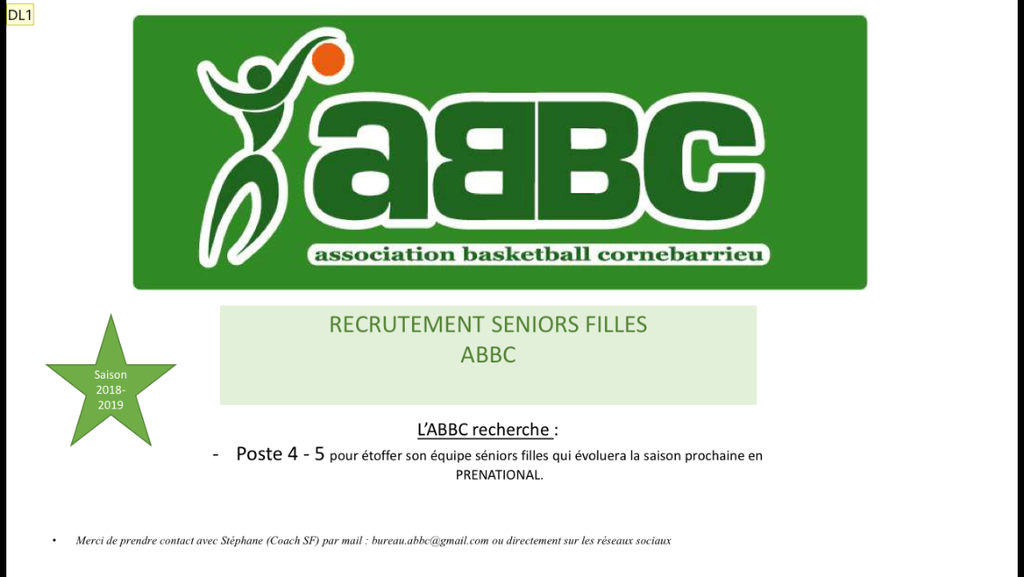 Notre équipe SF1, qui évoluera en championnat Prénationale pour la saison 2018/2019, recherche un poste 4 ou 5 afin d'étoffer son effectif.